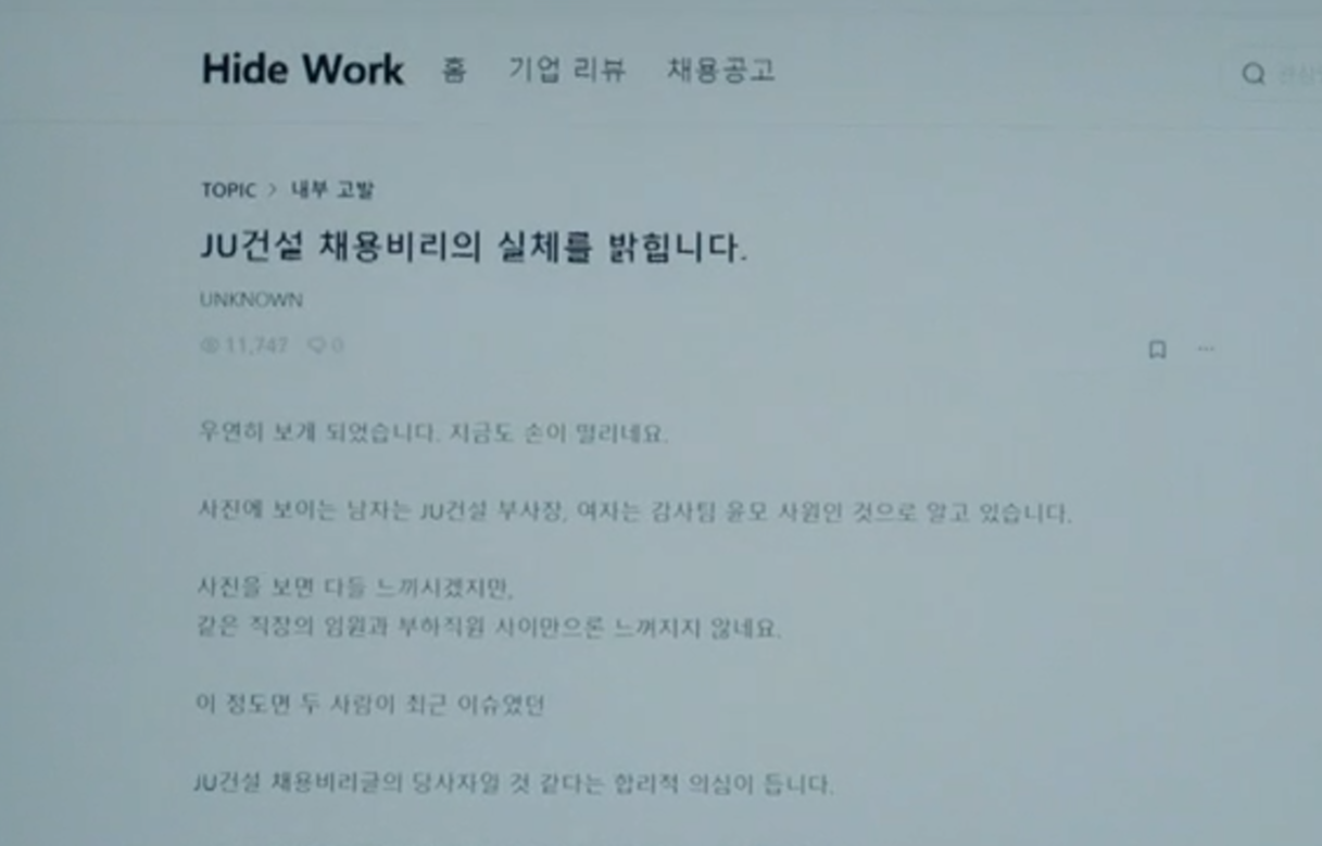 감 그렇게 기술유출 사건의 여파가 채 가시기도 전에 JX건설 채용비리가 게시판에 올라가게 됩니다.