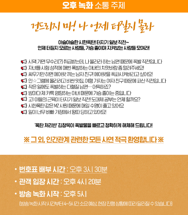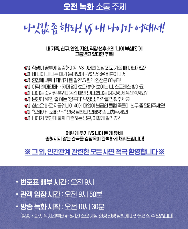 김창옥쇼3 방청신청 5차는 소통주제는 오전은 나잇값 좀 해라! 내 나이가 어때서 와 오후는건드리지마 나 언제 터질지 몰라 입니다.