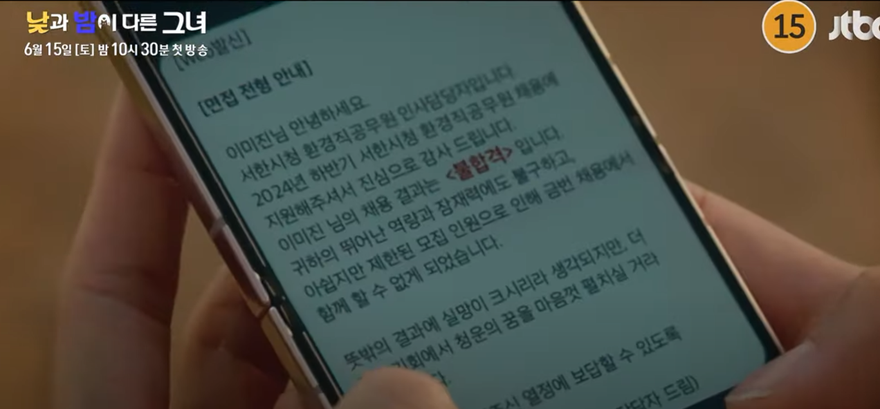 낮과 밤이 다른 그녀 1회에서 미진은 서한시 시니어 인턴에 합격을 하게 되고 미진은 엄마의 동생의 임순의 이름으로 합격하게 됩니다. 자신의 인생에 한 번도 합격이라는 거 없었는데 합격에 감격합니다.
