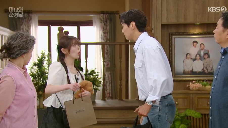 마리는 아침부터 필승이 보겠다고 집에 왔죠 마리는 필승에게 선물합니다.