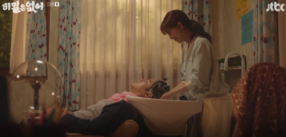 지친 기백에게 우주는 자신이 위로받는 방법 머리를 감리를 감겨줍니다.