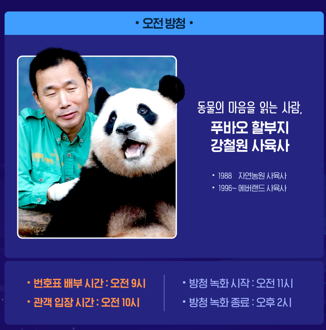 - 오전에는 동물의 마음을 읽어 주시는 푸바오 할아버지 강철원 사육사님 녹화를 방청하게 된다고 합니다.