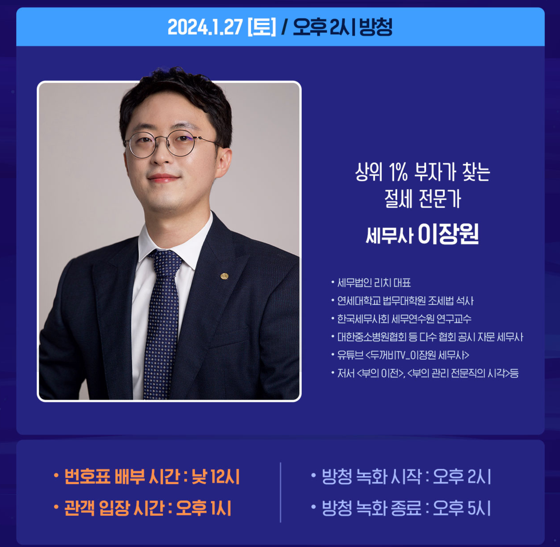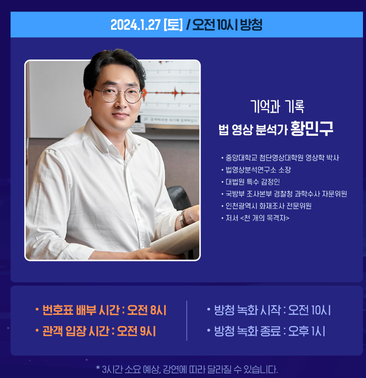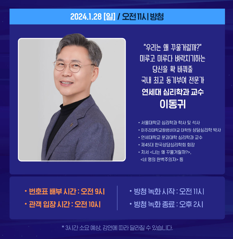 법 영상 분석가 황민구, 절세전문가 세무사 이장원, 최고 동기부여 전문가 연세대 심리학과 교수 이동귀, 서울 아산병원 내과 교수 정희원님 참여하시는 것 같습니다. 주제들이 재미있는게 많은것 같아요/ 절세를 하는 방법부터 벼락치기를 자꾸 하게 되고 미루는 습관이 있다면 동기부여 전문가 이동귀 교수님도 재미있을것 같아요