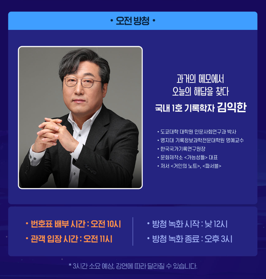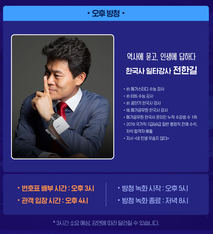 - 이 시간보다 일찍 오시는 방청객분들에 대해서는 안전 문제로 인해 티켓 배부가 되지 않을 수 있습니다.