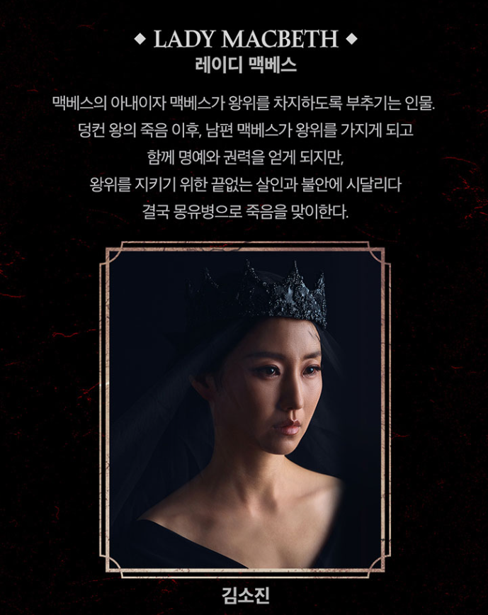 김소진이 맡은 레이디 멕베스는 맥베스의 아내이자 맥베스가 왕위를 차지하도록 부추기는 인물입니다. 덩컨 왕의 죽음 이후, 남편 맥베스가 왕위를 가지게 되고 함께 명예와 권력을 얻게 되지만, 왕위를 지키기 위한 끝없는 살인과 불안에 시달리다 결국 몽유병으로 죽음을 맞이한다고 합니다.