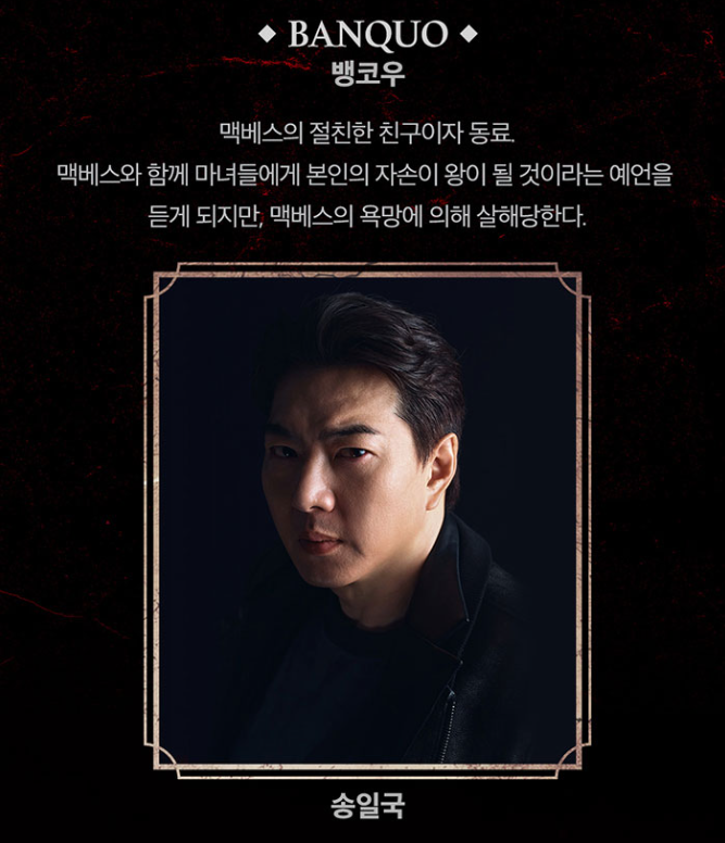 송일국의 뱅코우는 맥베스의 절친한 친구이자 동료입니다. 맥베스와 함께 마녀들에게 본인의 자손이 왕이 될 것이라는 예언을 듣게 되지만, 맥베스의 욕망에 의해 살해당하게 됩니다.