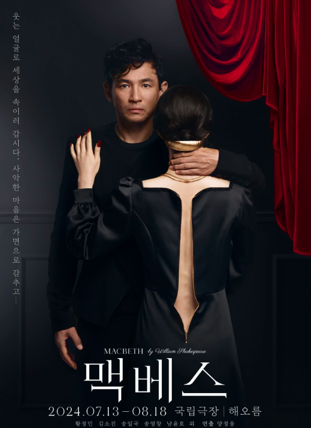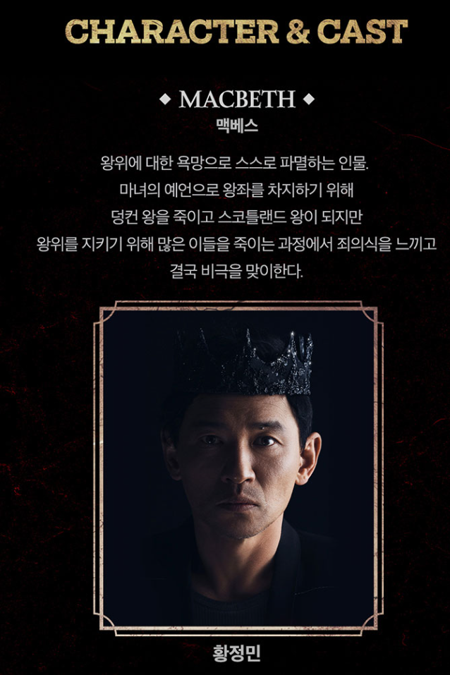 황정민이 맡은 맥베스는 왕위에 대한 욕망으로 스스로 파멸하는 인물이라고 해요 마녀의 예언으로 왕좌를 차지하기 위해 덩컨 왕을 죽이고 스코틀랜드 왕이 되지만 왕위를 지키기 위해 많은 이들을 죽이는 과정에서 죄의식을 느끼고 결국 비극을 맞이한다고 해요
