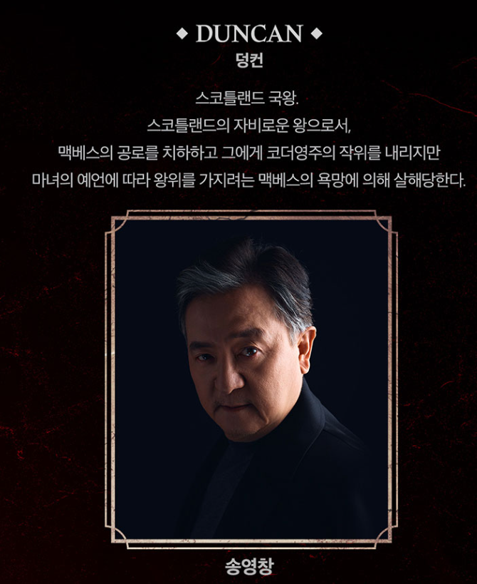 송영창이 맡은 덩컨은 스코틀랜드의 자비로운 왕으로서 맥베스의 공로를 치하하고 그에게 코더영주의 작위를 내리지만 마녀의 예언에 따라 왕위를 가지려는 맥베스의 욕망에 의해 살해되는 인물이라고 합니다.