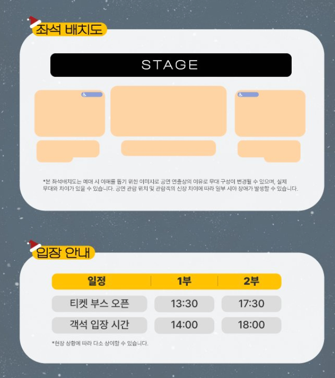 - 예매하신 좌석에 대한 변경은 불가능합니다. 당일 티켓 현장 판매는 예매 마감 후 잔여석이 있을 시 진행됩니다.