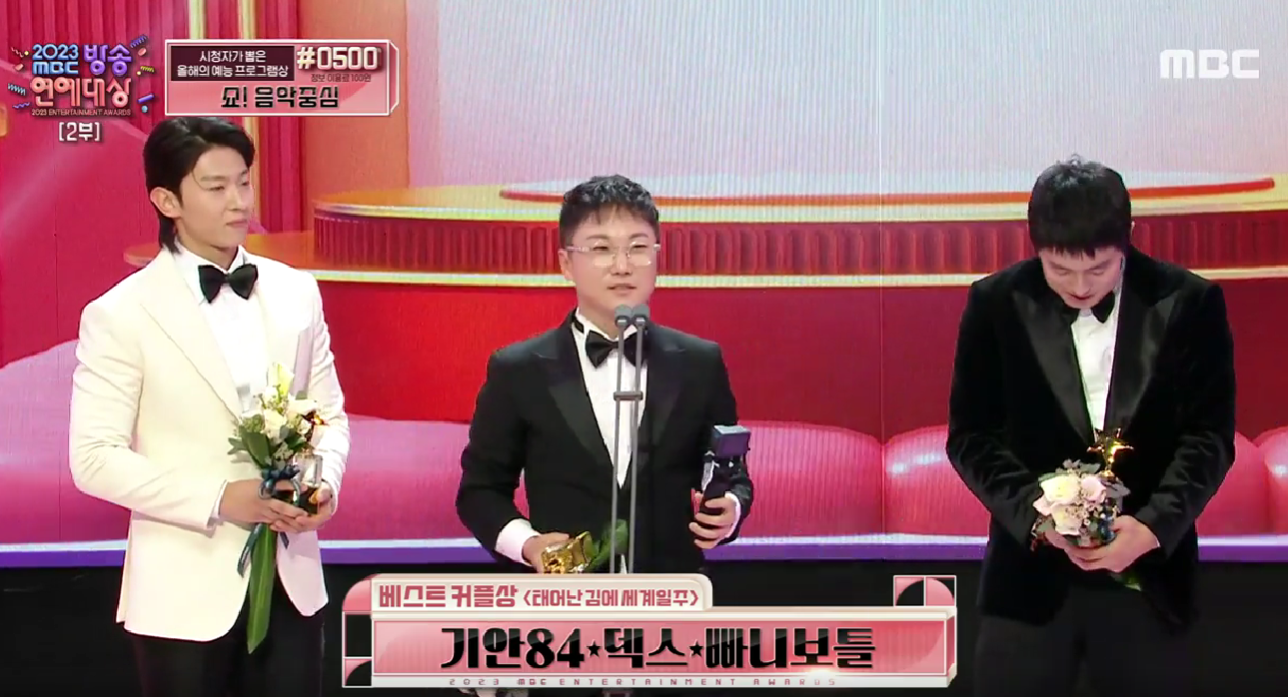 MBC 방송 연예대상의 베스트 커플상은 태어난 김에 세계일주 기안 84, 덱스, 빠니보틀이 받았습니다.