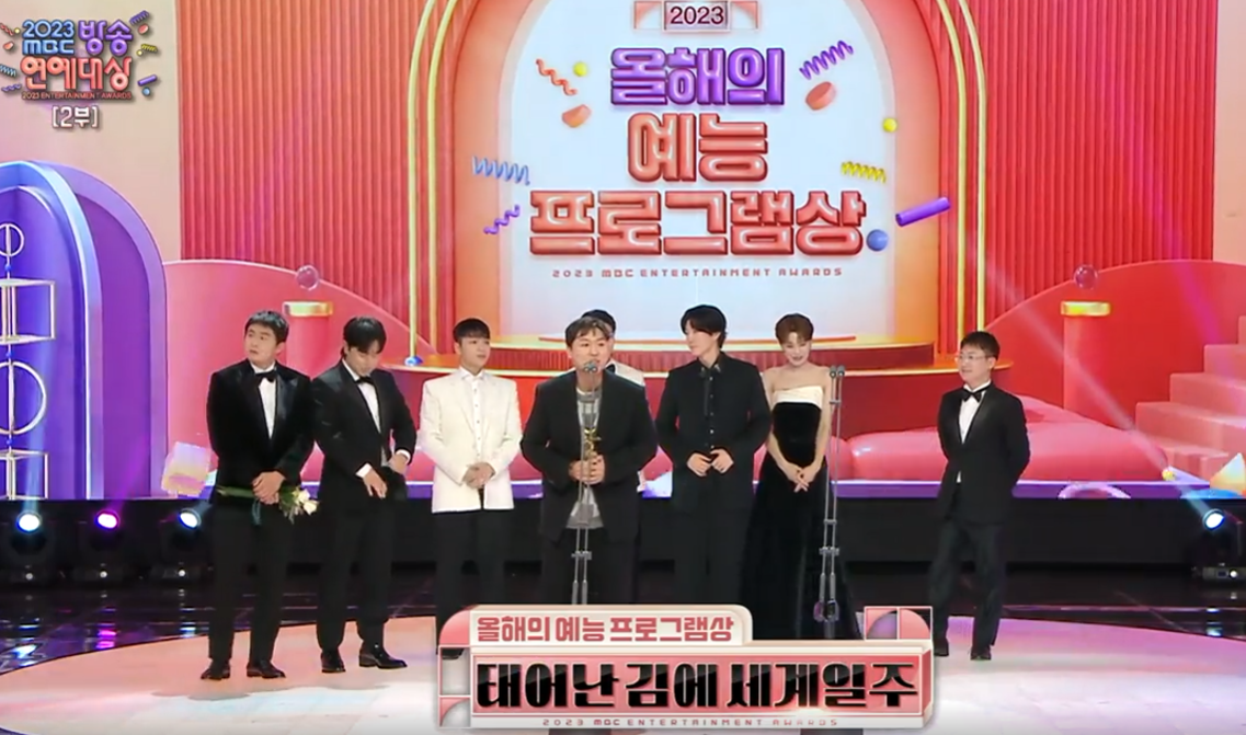 2023 MBC 방송 연예대상의 올해의 예능프로그램상은 태어난 김에 세계일주가 받았습니다. 소수의 인원이 만들어 갔다고 해요. 출연자분들이 현장에서 풀어나갈 수 있도록 작업했다고 해요 출연진분들도 많이 힘들었을 거라고 해요 그래야 널 날것으로 표현할 수 있다고 생각했다고 합니다. 스텝분들이 2인분 이상의 일을 해왔다고 하시네요