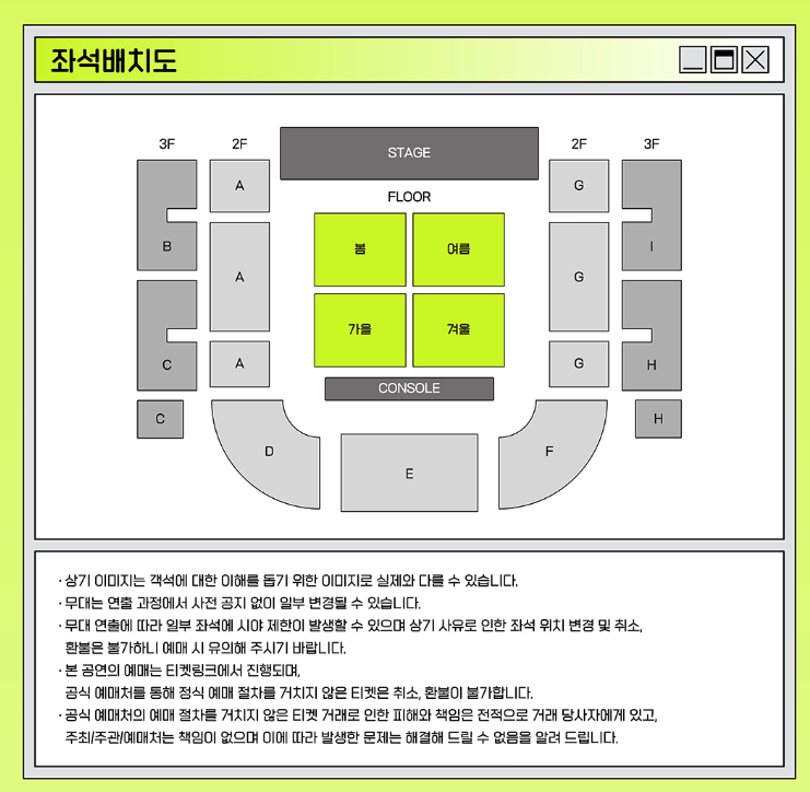 2) 2024 김성규 단독 팬미팅 콘서트[ㅅ ㄱ2:사계] 좌석 배치도는 다음과 같습니다.