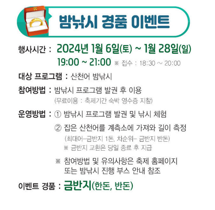 - 산천어 밤(야간) 낚시 경품 이벤트 기간은 24년 1월 6일 ~ 24년 1월 28일까지입니다.
